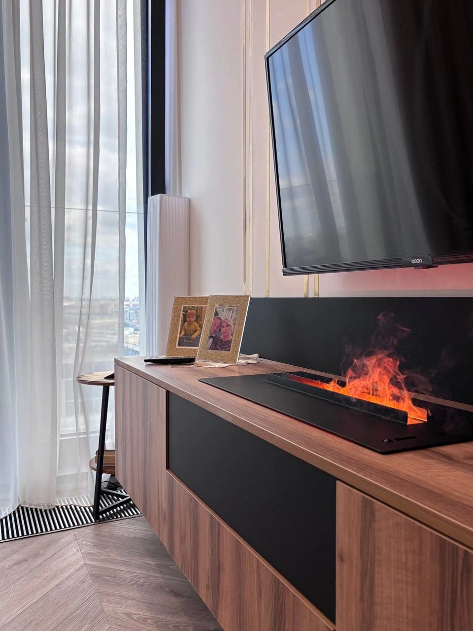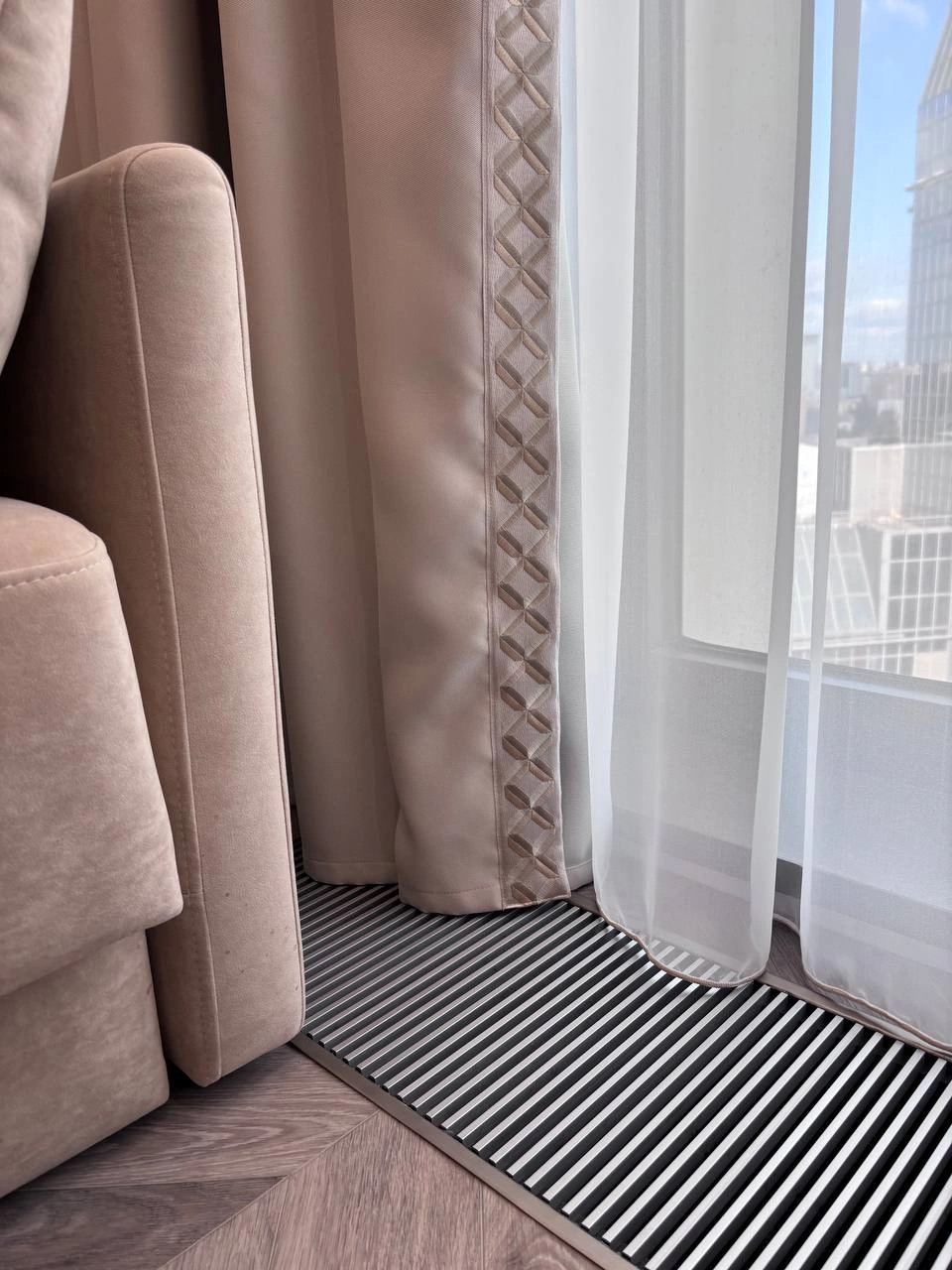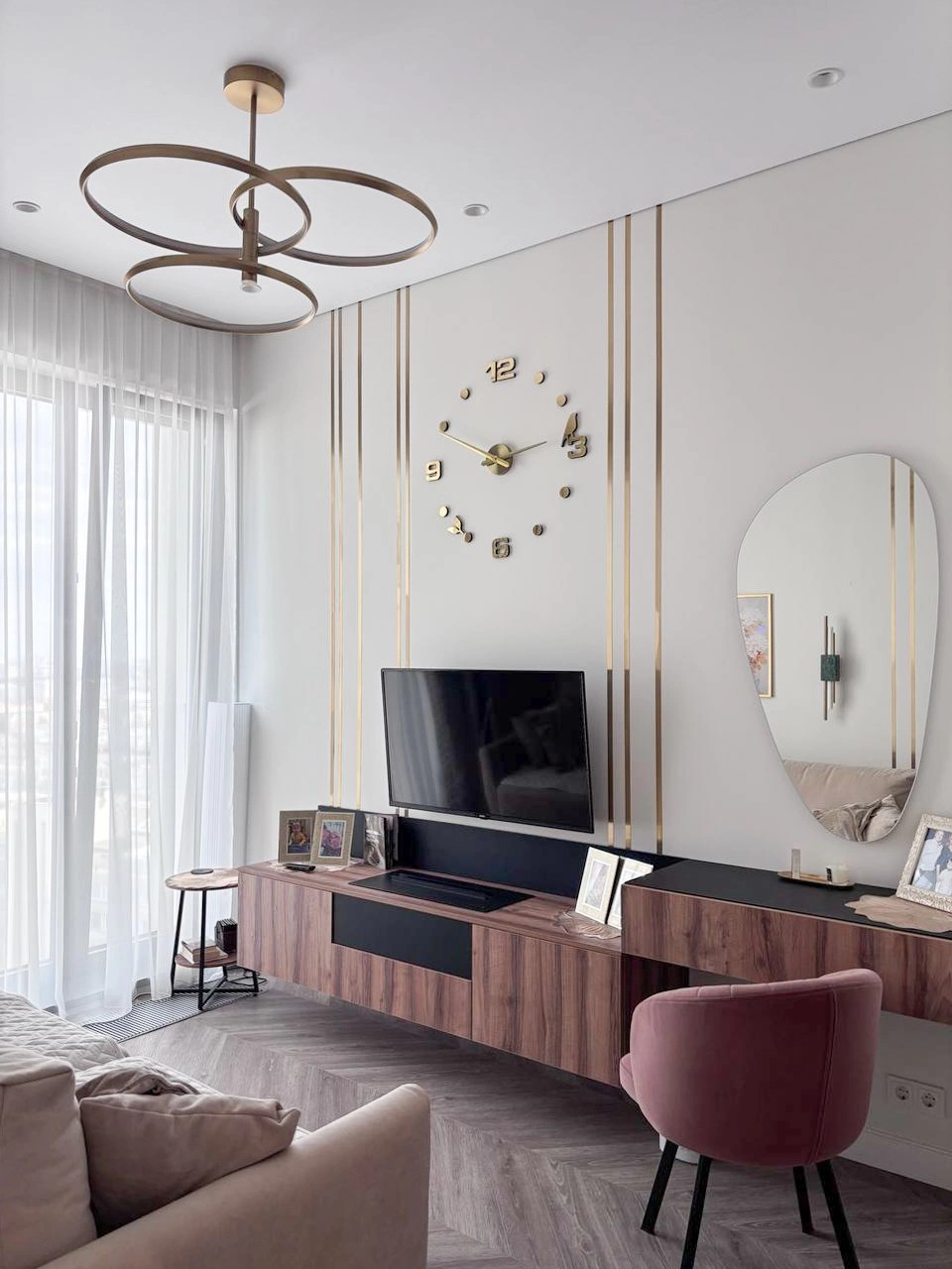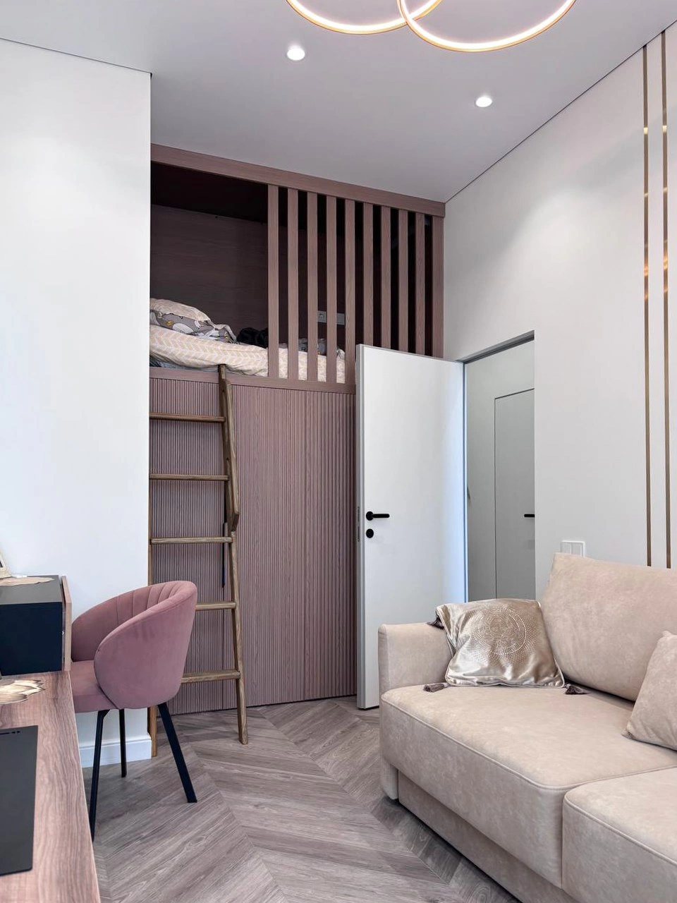 Гостиная-спальня. Было принято решение отказаться от объединенных студий-пространств, чтобы все обитатели этого дома могли спокойно высыпаться. Гостиную совместили не с кухней и столовой, а со спальней, и получилась изолированная уютная комната.